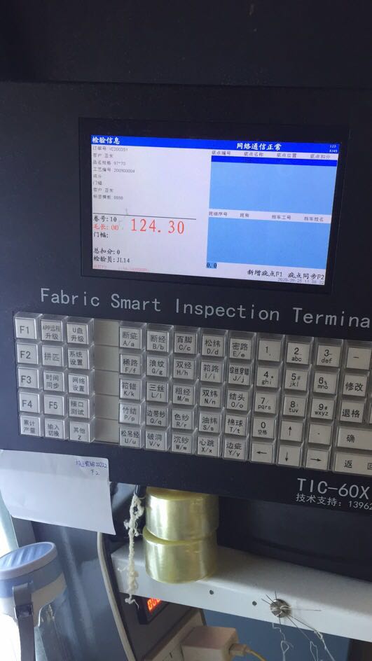 现场23台打卷机全部安装TIC-60疵点数据采集终端和条行码打印机,自动采集验布机长度,每卷验布好后标签自动打印,验货码单数据实时上传打印。